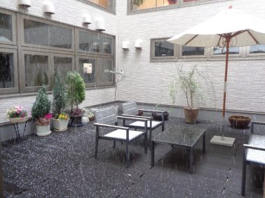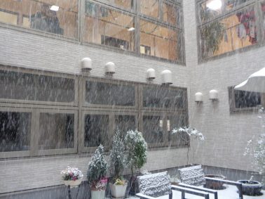 2月8日(日)、1階光庭の様子です。 午前に引き続き、午後からも雪が降っています。 「今季最強の寒波到来」とニュースで流れているのを見ると、私たち職員は通勤の心配をしてしまいます💦