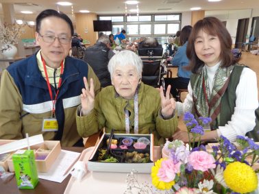 今年のお花見弁当のメニューは・・・ 「助六寿司・魚の塩焼き・肉団子・菜の花の和え物・お吸い物・練り切り等」でした。 いつもは少食な方も、沢山召し上がっておられました。