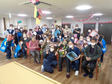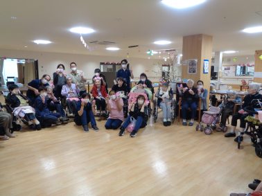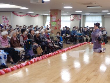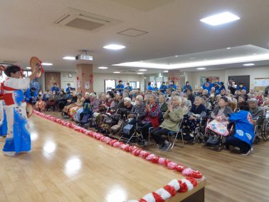 6区・7区女性会の皆さまにお願いし、歌や踊りなど素晴らしい演芸を披露していただきました。 衣装も素敵で、利用者さまは大喜びでした。