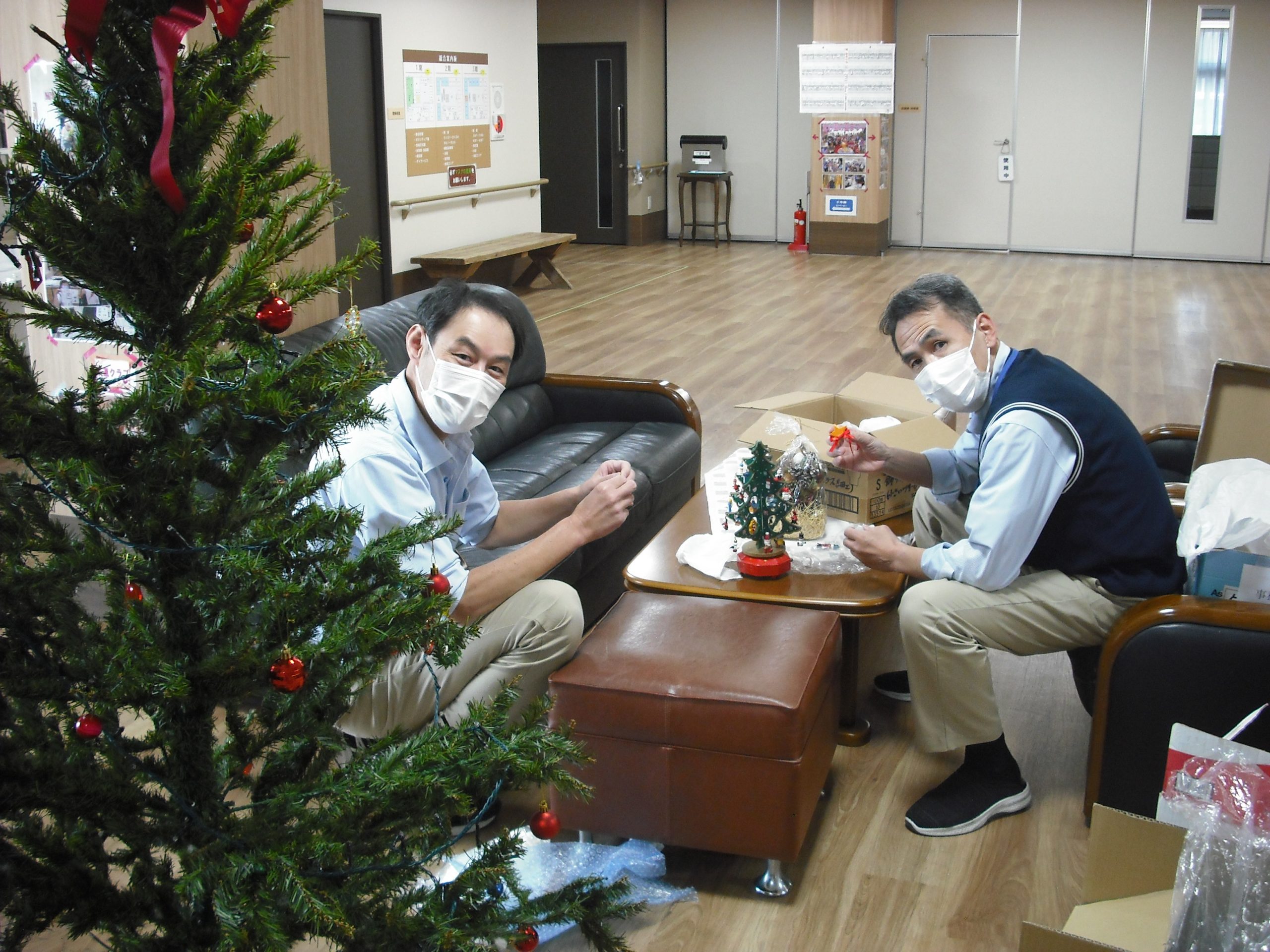 事務所の男性職員2人が頭を寄せ合い、仲良くクリスマスツリーの飾りつけをしていました。