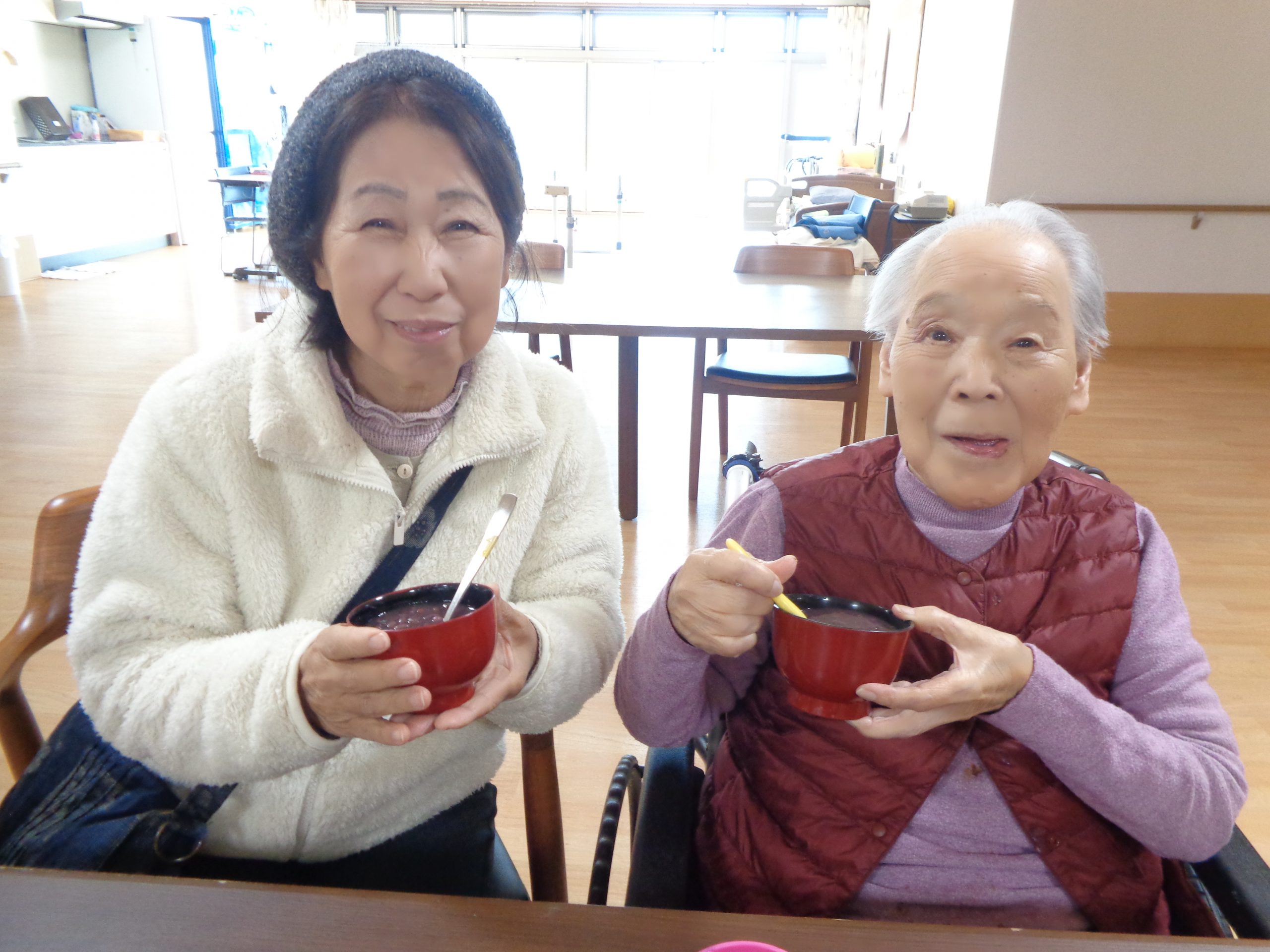 2025年12月29日(月) ぜんざい会 ~一緒にぜんざい嬉しいね~ 仲良し親子のYさんです。 娘さんがちょうど面会に来られたので、一緒に召し上がっていただきました。 お母さま、とっても嬉しそうでした😊 一覧に戻る