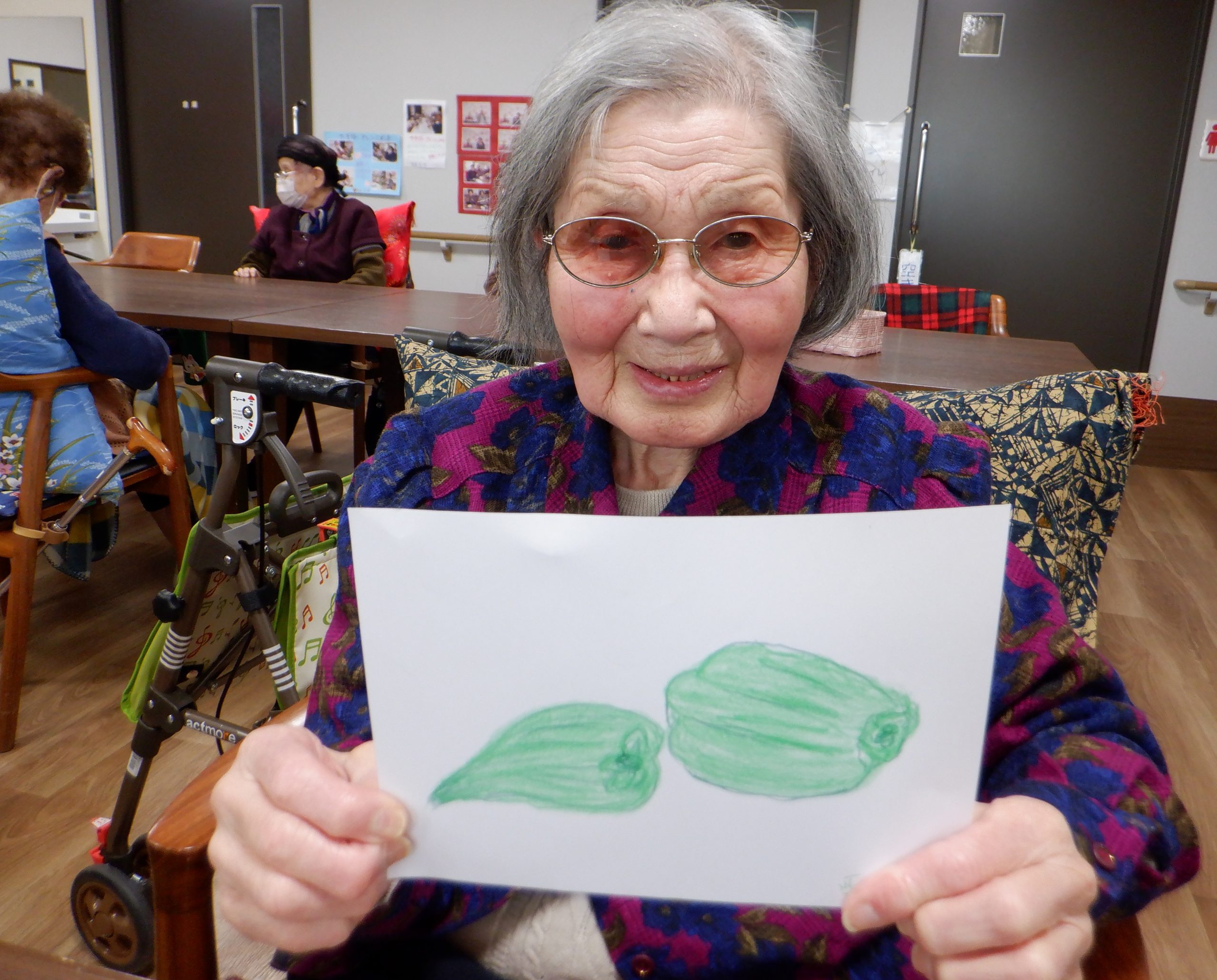 2026年3月26日(木) デイサービス みんなでスケッチ! 「みんなでスケッチ!」 今月のお題は「野菜」です。 キュウリ・レタス・ニンジン・ピーマンなど。 色鮮やかなピーマンを描かれており、とても美味しそうです! 一覧に戻る