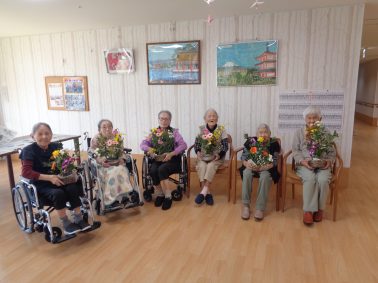 今日は生花クラブがありました。 職員と楽しくお喋りしながら、こんな素敵な作品が出来上がりました🏵️