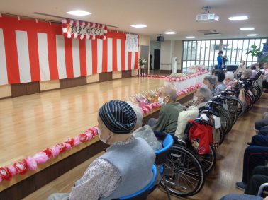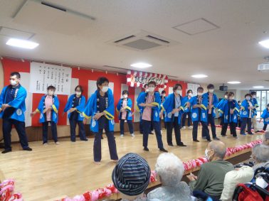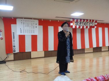 昼休憩に練習をしてきた「おめでた音頭」と「洗心園音頭」を職員が披露しました。 めでたい行事で恒例となっている踊りは、会場の皆さまも一緒に踊ってくださいました。